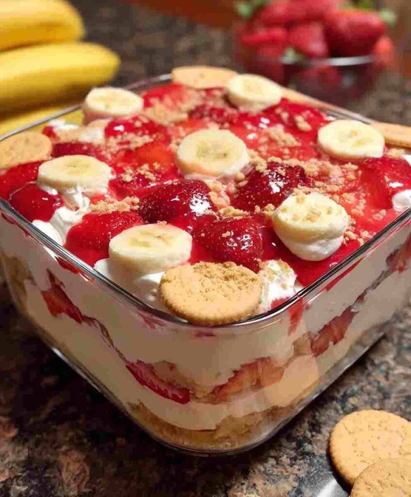 If you’re craving a creamy, fruity, and crowd-pleasing dessert that’s quick to prepare, this Banana Strawberry Pudding Dessert is the perfect choice. Made with layers of vanilla wafers, fresh bananas, juicy strawberries, a rich pudding mixture, and a light whipped topping, it’s a no-bake dessert that always impresses. Whether you’re hosting a family gathering, holiday dinner, or summer barbecue, this layered pudding dessert delivers the ideal combination of flavor and texture.