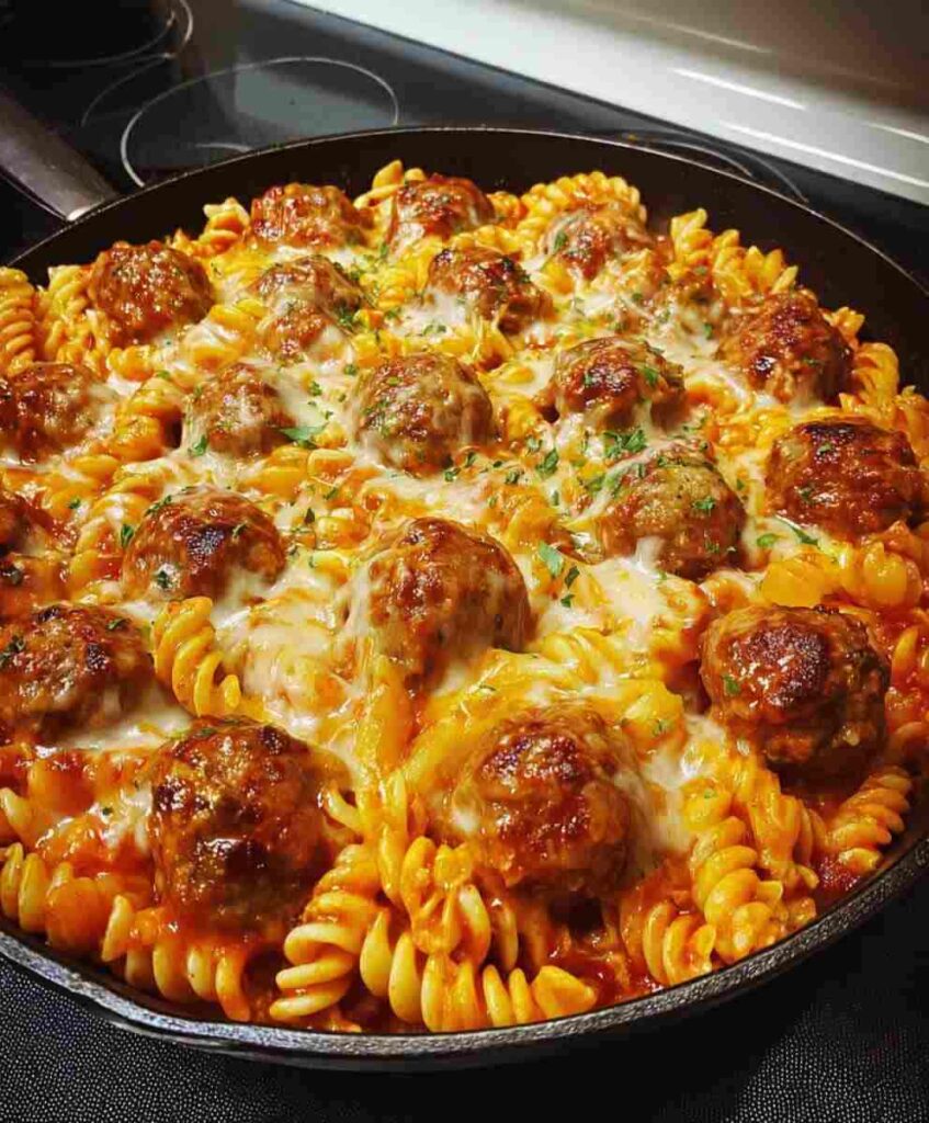 A quick and hearty one-skillet meal made with tender meatballs, pasta, BBQ ranch sauce, and melted cheddar cheese. Perfect for busy weeknights and family-friendly dinners.