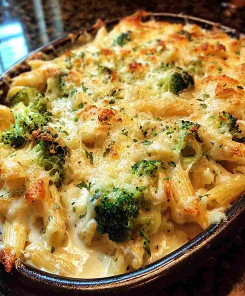 This comforting Chicken & Broccoli Alfredo Bake combines tender pasta, creamy Alfredo sauce, juicy chicken, and broccoli, all baked together with a golden cheese topping.