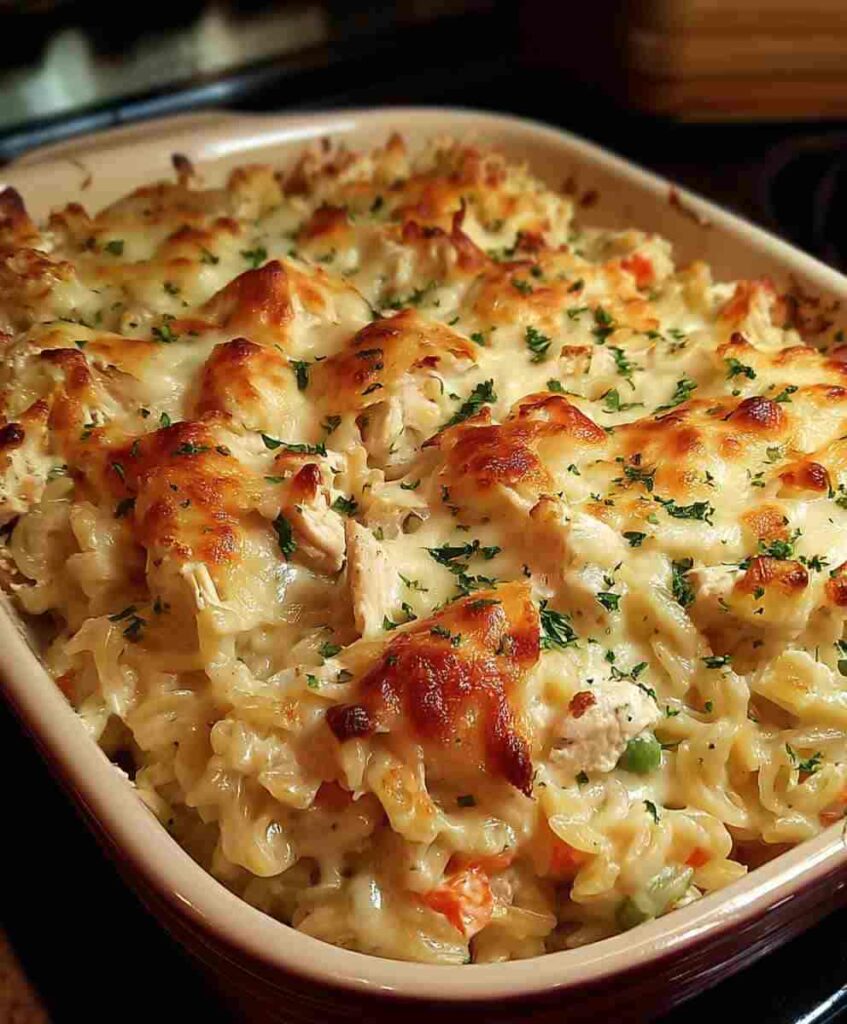 This Creamy Chicken Alfredo Rice Casserole is a cozy, one-pan comfort meal made with tender chicken, Alfredo sauce, and perfectly cooked rice baked under a melty mozzarella topping. Perfect for busy nights or family dinners.