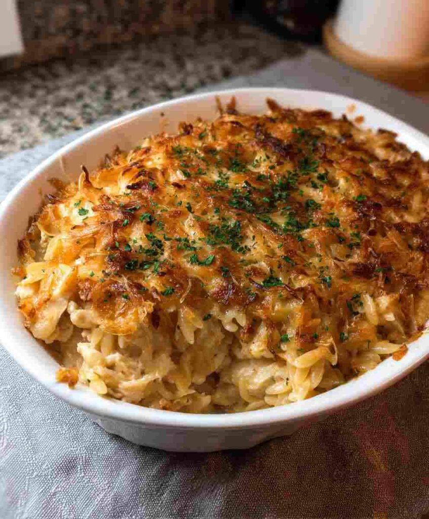 This French onion chicken orzo casserole combines deeply caramelized onions, tender shredded chicken, and creamy, cheesy orzo baked until bubbly and golden. Inspired by classic French onion soup flavors, it’s a comforting one-pan dinner.
