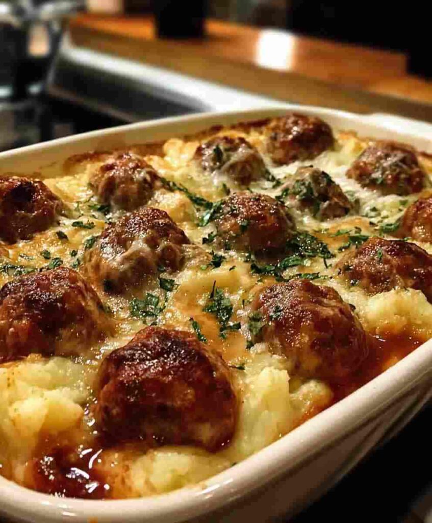 A cozy comfort dish combining juicy meatballs, creamy mashed potatoes, rich brown gravy, and a cheesy golden topping — perfect for weeknights or family gatherings.