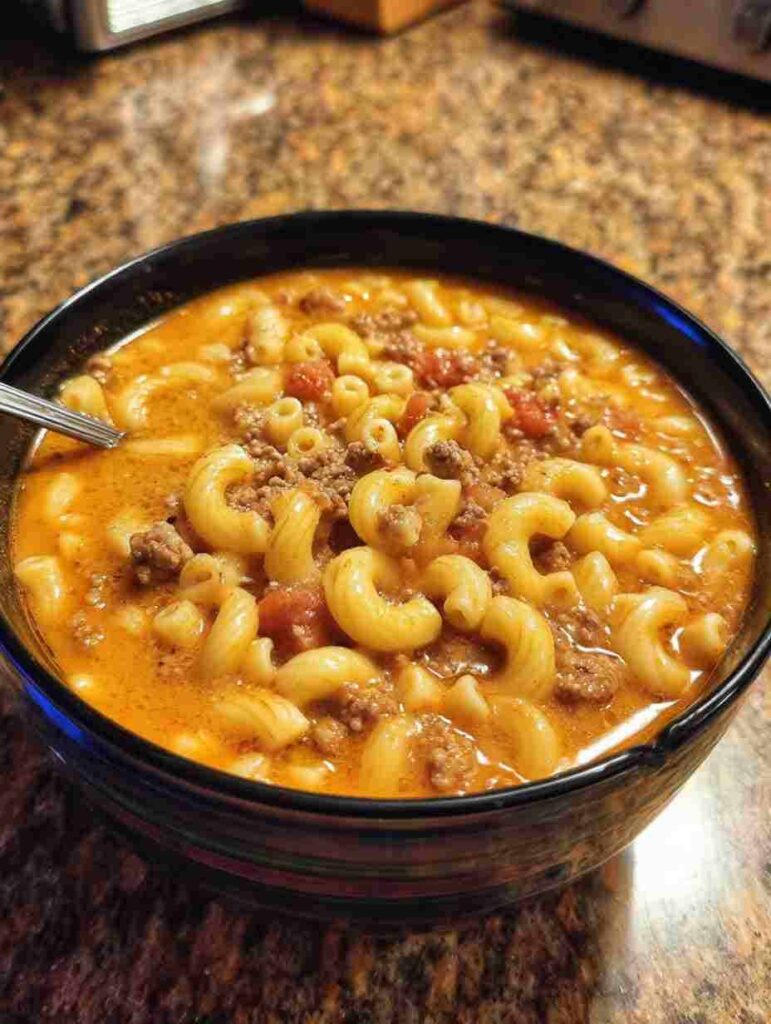 This hearty one-pot macaroni cheeseburger soup combines ground beef, macaroni, and cheddar cheese in a rich, creamy broth — the ultimate cozy comfort meal made in under 30 minutes.