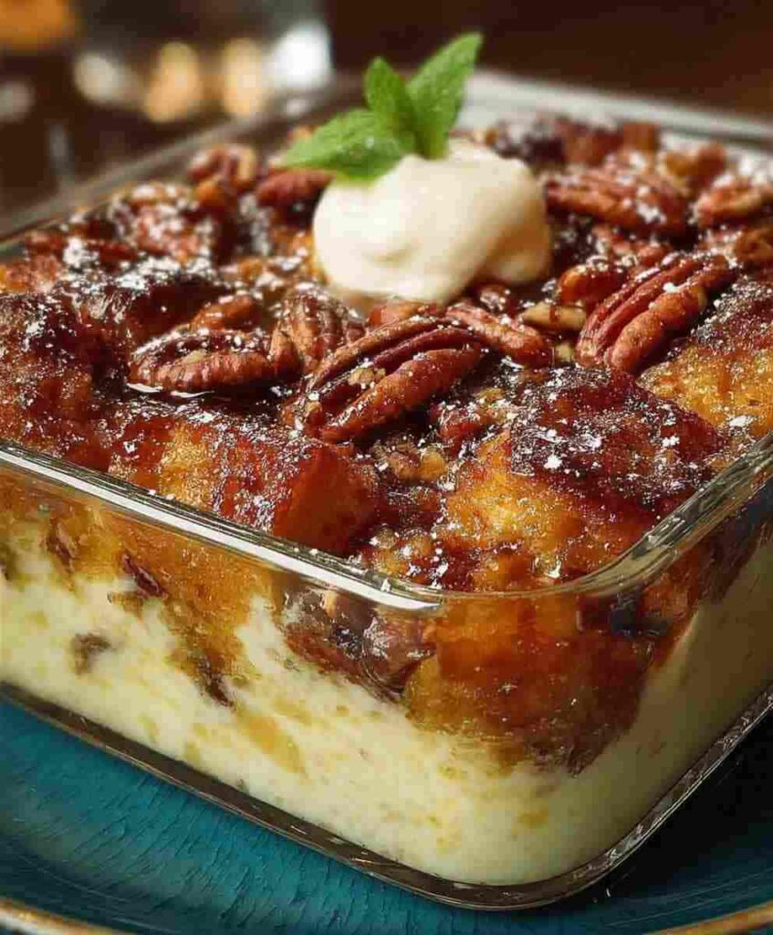 Baked until golden and topped with a sticky pecan topping, this bread pudding delivers deep caramel flavor, soft bread soaked in spiced custard, and crunchy pecans in every bite. Whether served warm with vanilla ice cream or enjoyed on its own, it’s a dessert that always impresses.