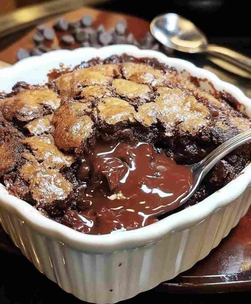 Because of its cobbler-like texture on top and rich sauce underneath, this dessert resembles traditional fruit cobblers but with a chocolate twist.