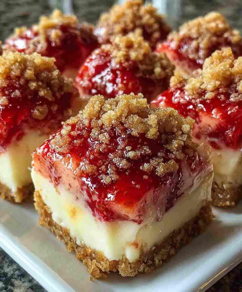 Mini cheesecakes with a buttery cookie crust, creamy strawberry filling, and a crunchy strawberry topping — these Strawberry Crunch Cheesecake Bites are perfectly sweet, creamy, and irresistibly bite-sized!